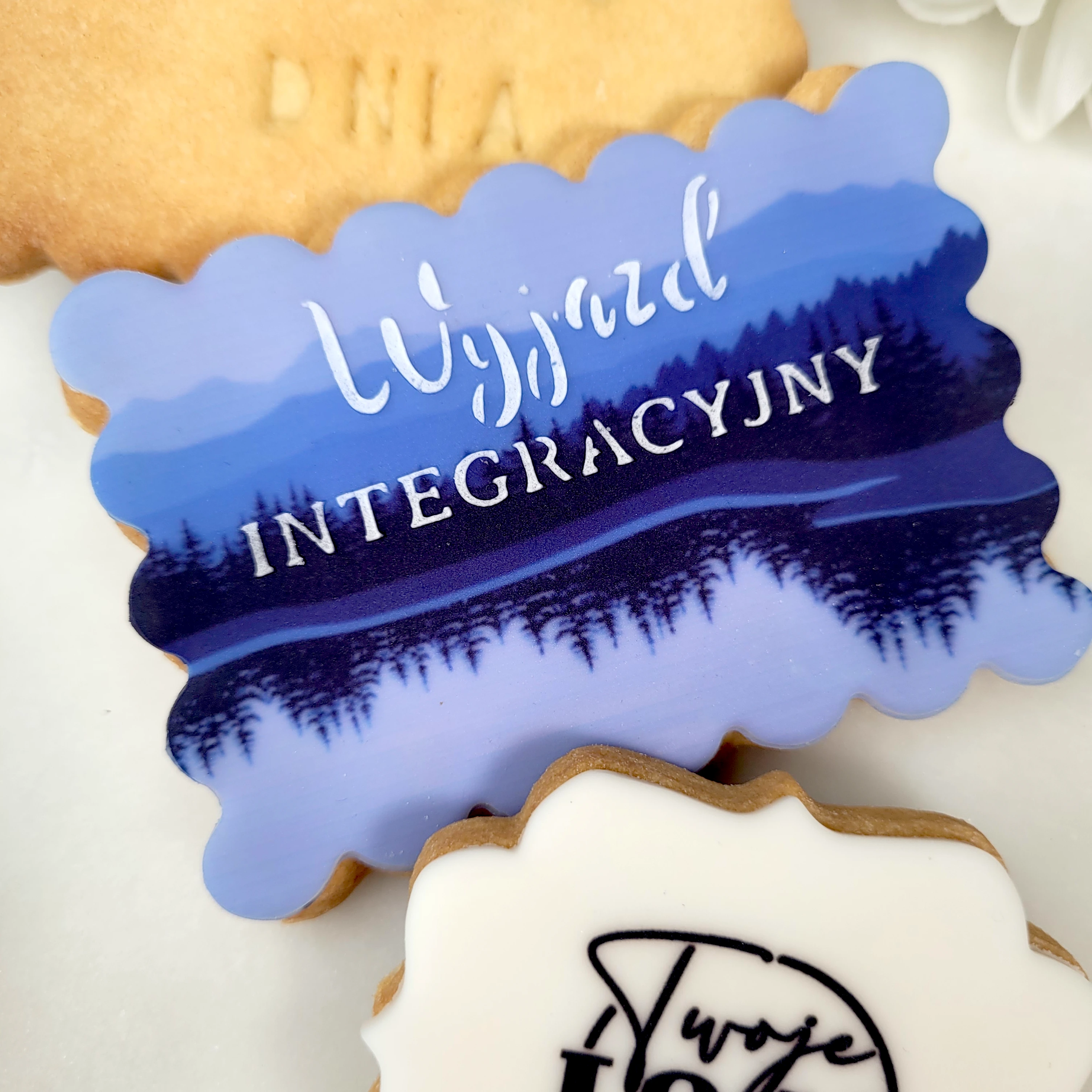 W zestawie znajdziesz: Ciasteczko maślane w kształcie herbatnika – klasyczne, najpyszniejsze, bez lukru, z Twoim własnym tłoczonym napisem (możliwość personalizacji napisu), Ciasteczko lukrowane z piękną grafiką przedstawiającą jezioro i las w odcieniach błękitu oraz napisem „Wyjazd integracyjny” (idealnie oddaje klimat wspólnego wyjazdu!)oraz mini ciasteczko z logo Twojej firmy.