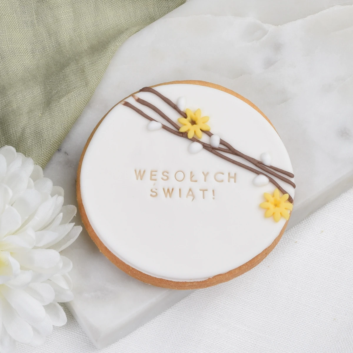 Ciasteczko w kształcie koła z wielkanocnym wiankiem z wiosennych gałązek, bazi i kwiatków. Kwintesencja Wielkanocy! Ciasteczko świetnie sprawdzi się jako prezent dla gości na świątecznym śniadaniu lub upominek dla pracowników. Będzie również piękną ozdobą domu, która wprowadzi świąteczną atmosferę do twojego wnętrza. Na ciasteczku możesz umieścić swój własny tekst. Każde ciasteczko pakujemy w woreczek, przewiązujemy lnianym sznureczkiem i dodajemy kraftowy bilecik. Na bileciku umieścimy napis, który wskażesz spośród kilku naszych propozycji.