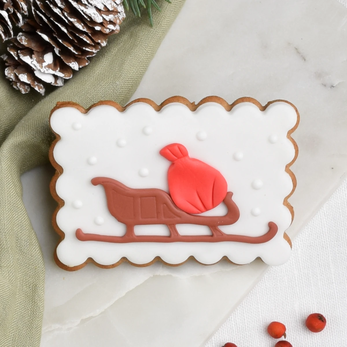 Ciasteczko lukrowane z motywem sani Świętego Mikołaja i worem pełnym prezentów. Działa na wyobraźnię, co? To ciasteczko będzie świetnym prezentem na Mikołajki albo uroczą bożonarodzeniową dekoracją. Każde ciasteczko pakujemy oddzielnie w woreczek, przewiązujemy lnianym sznureczkiem i dodajemy bilecik. Możesz wybrać tekst z pośród naszym propozycji.