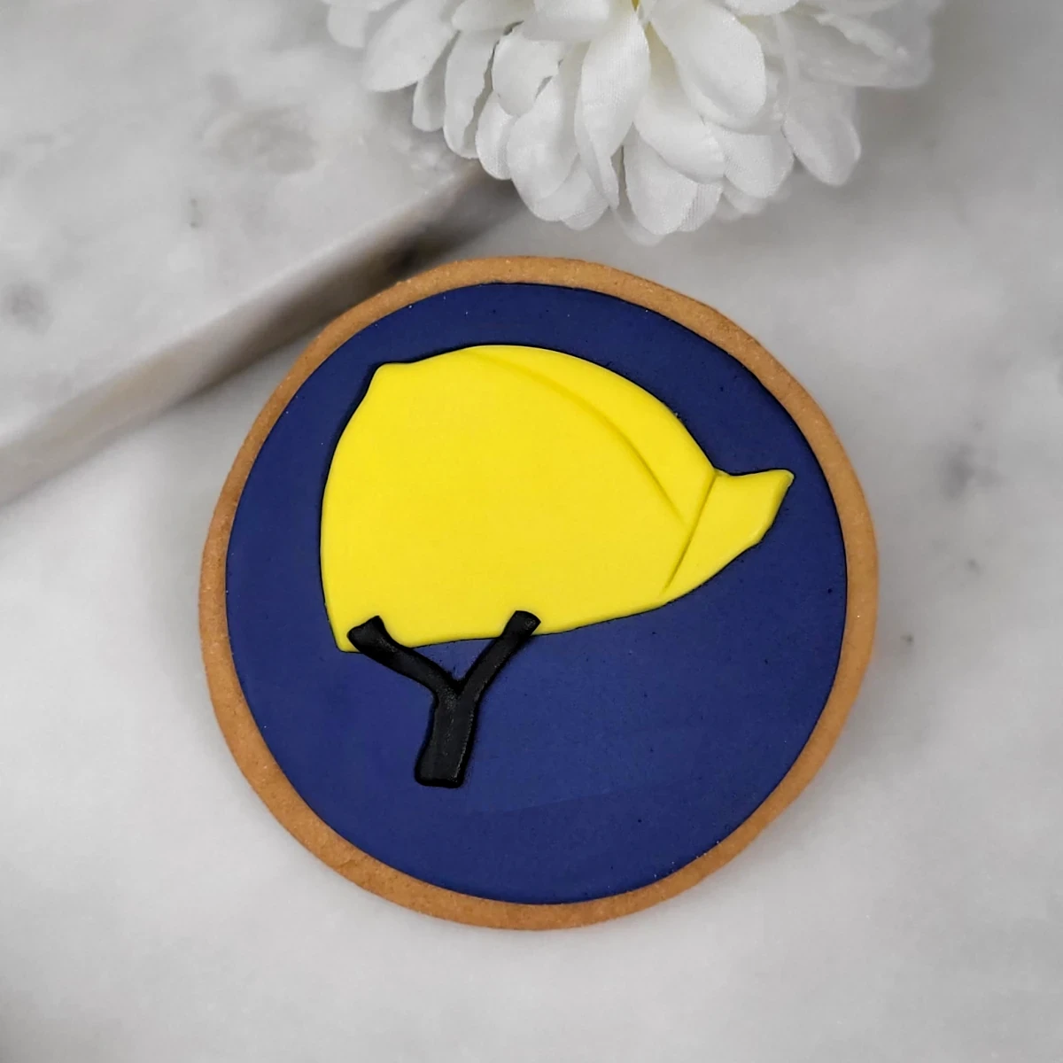 To maślane ciasteczko z motywem żółtego kasku budowlanego to słodki ukłon w stronę wszystkich, którzy dbają o bezpieczeństwo pracy. Na granatowym lukrze umieściliśmy żółty kask ochronny, który natychmiast przywołuje skojarzenia z branżą budowlaną, remontową i instalacyjną.