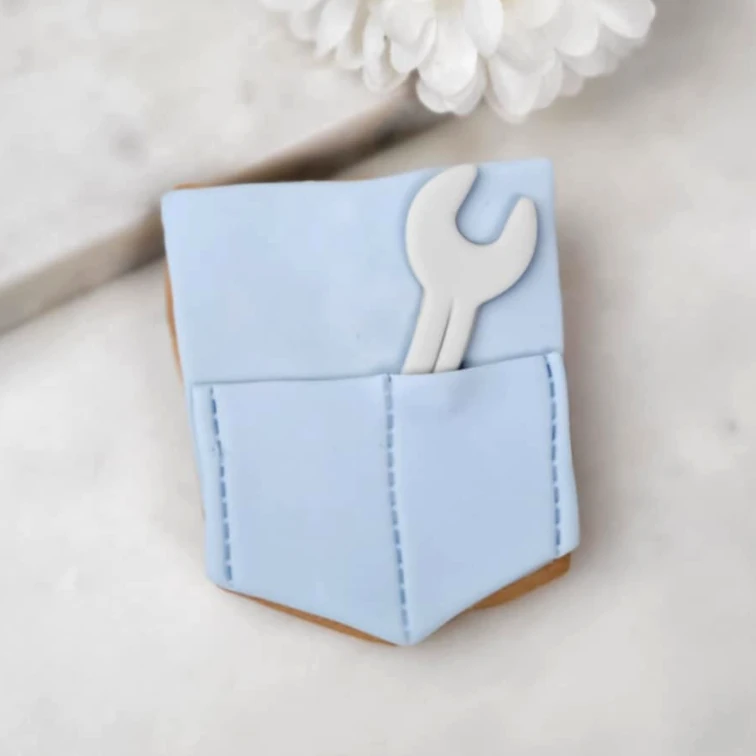 Słodki ukłon w stronę fachowców! Nasze ciastko w kształcie kieszeni budowlańca to wyjątkowy upominek dla osób z branży budowlanej – inżynierów, monterów, mechaników, operatorów maszyn czy ekip remontowych. Starannie zdobione, w kolorze błękitu roboczego, z precyzyjnie odwzorowanym kluczem płaskim wystającym z kieszeni – wygląda jak miniatura z prawdziwego pasa narzędziowego!