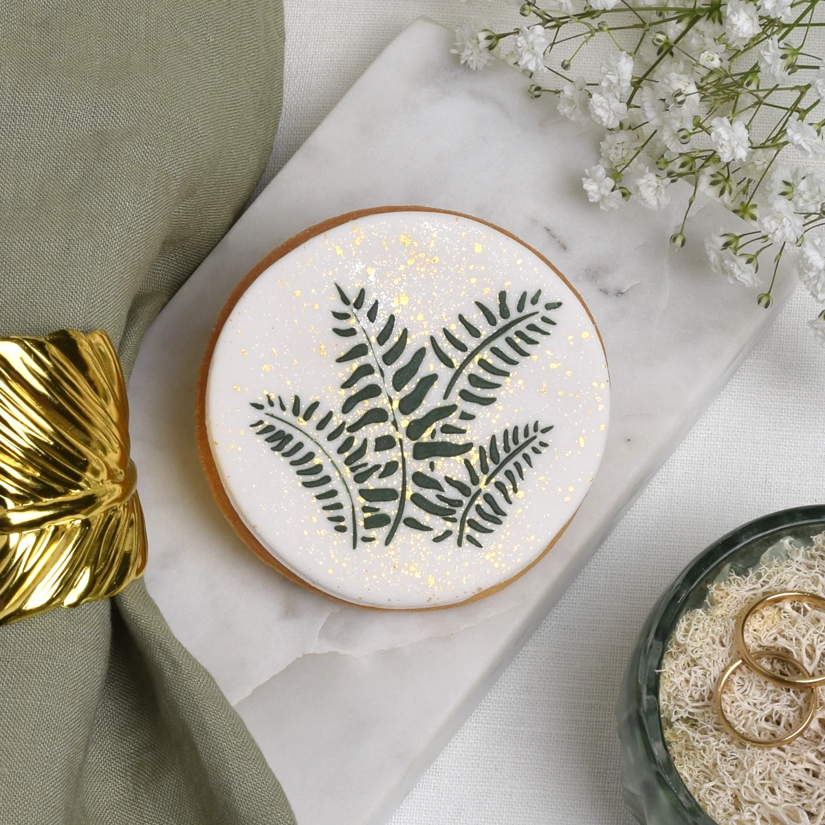 Pyszne maślane ciasteczko lukrowane z serii Stardust Botanica. Ciasteczko z motywem roślinnym, oprószone złotym pyłkiem (kochamy połączenie złota i liści!). Ciasteczko bez możliwości personalizacji. Każde ciacho zapakowane jest oddzielnie w woreczek przewiązany lnianym sznureczkiem i dodaną etykietką z eko kartonu. Ciasteczko nada się idealnie na podziękowanie dla gości na uroczystościach w stylu boho jak i glamour. Super pasuje również do chrzcin i komunii.