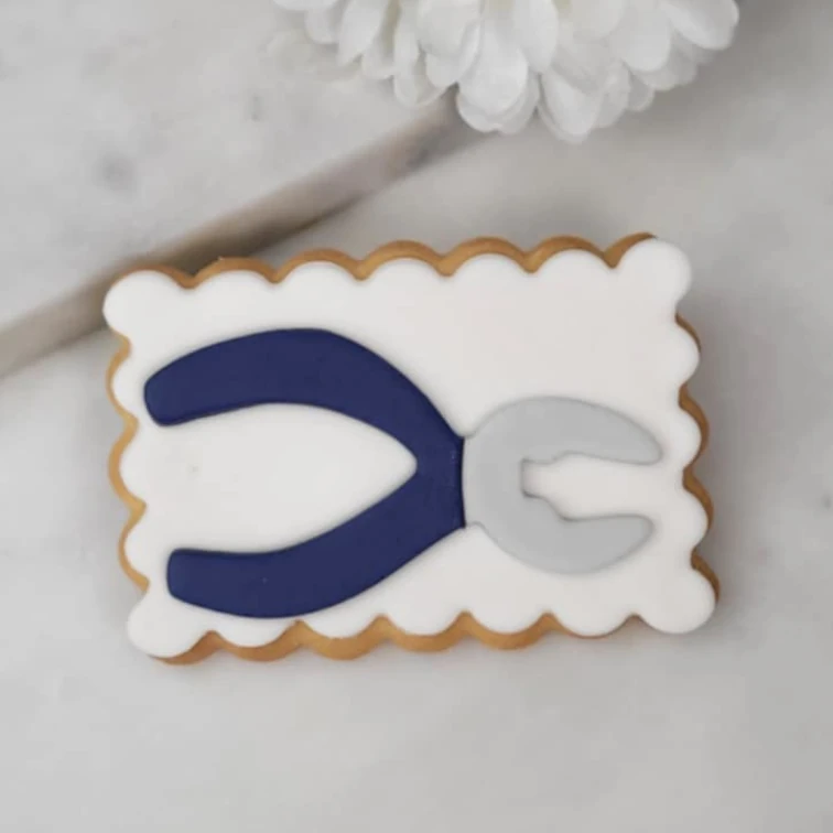 Maślane ciasteczko w kształcie herbatnika z białym lukrem, ozdobione lukrowanymi kombinerkami z granatowymi rączkami, to słodki detal, który świetnie wpisuje się w tematykę budowy, remontów i majsterkowania.