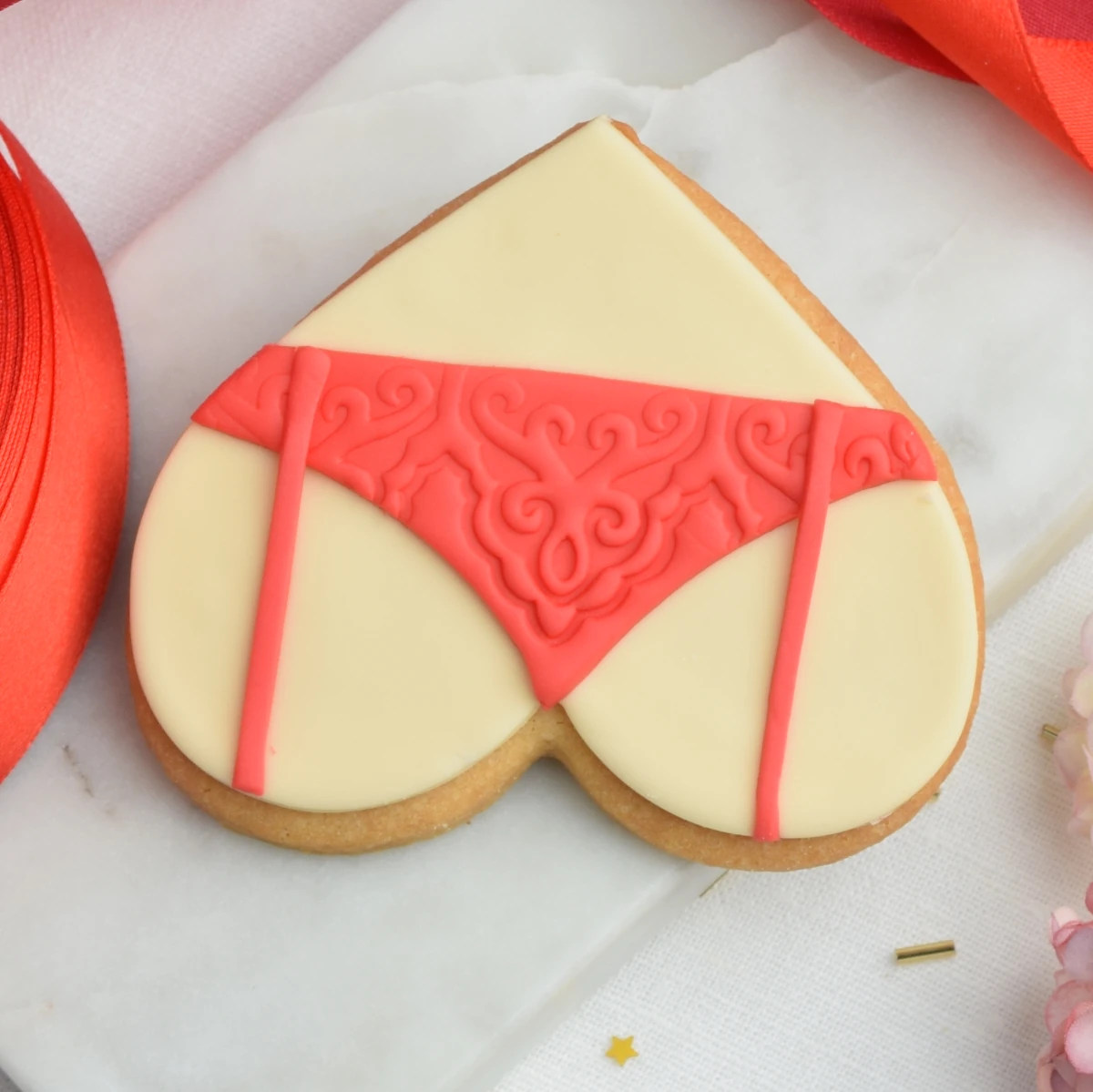 Słodkie ciasteczko o pięknych, krągłych kształtach, ubrane w lukrowane, koronkowe majteczkii z podwiązkami. Sprawdzi się jako walentynkowa obietnica wyjątkowego wieczoru, prezent na osiemnastkę z przymrużeniem oka albo będzie piękną ozdobą na evencie związanym z branżą modową. Ciasteczko pakujemy w woreczek, przewiązujemy lnianym sznureczkiem i dodajemy bilecik, który możesz personalizować. Możesz wybrać tekst spośród kilku naszych propozycji, który najbardziej będzie pasował do okazji na jaką potrzebujesz ciasteczek. Możesz również wybrać kolor majteczek: czarny albo czerwony.