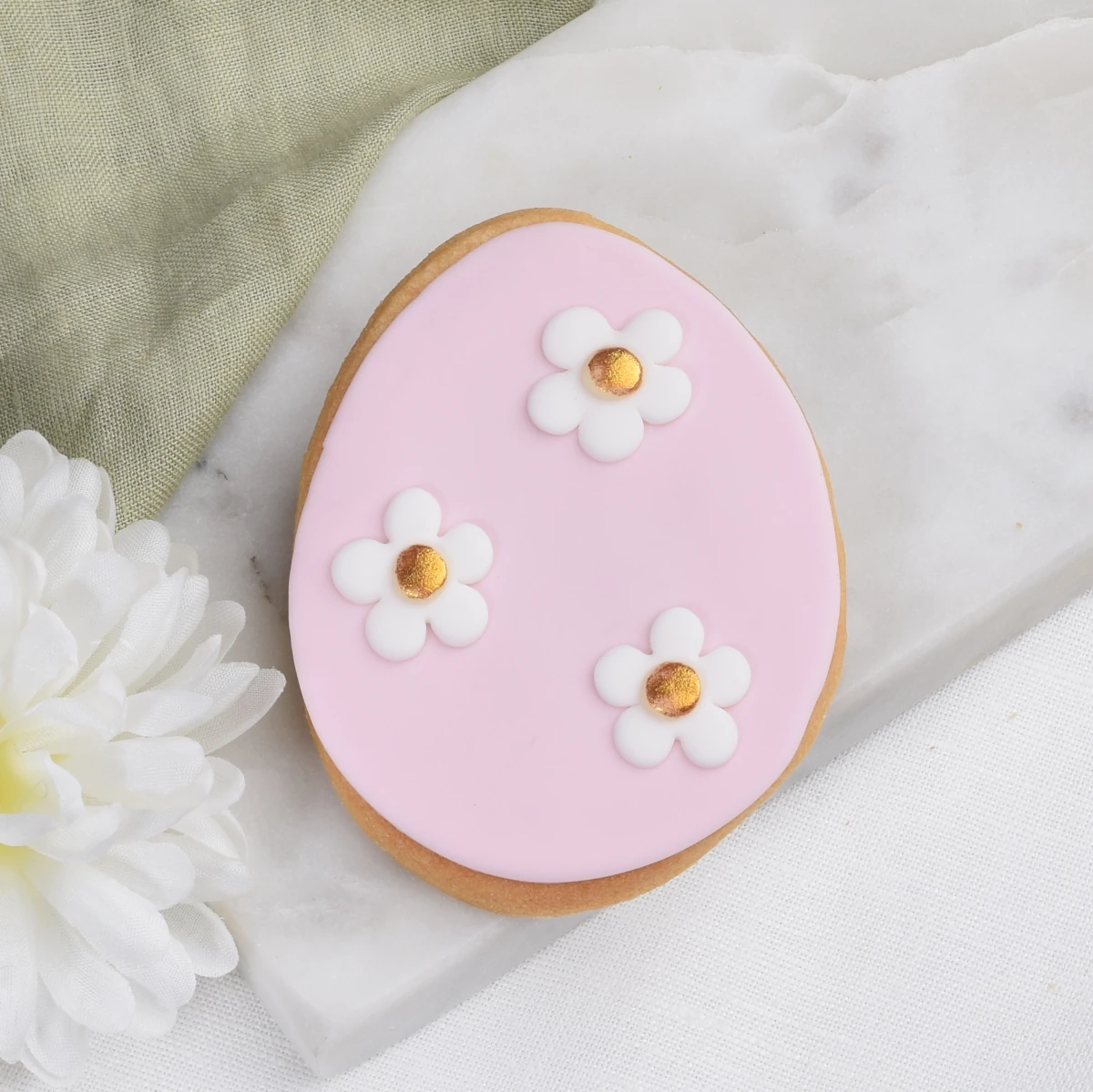 Ciasteczko w kształcie pisanki, pokryte bladym różowym lukrem ozdobione białymi kwiatkami z uroczymi, złotymi środkami.