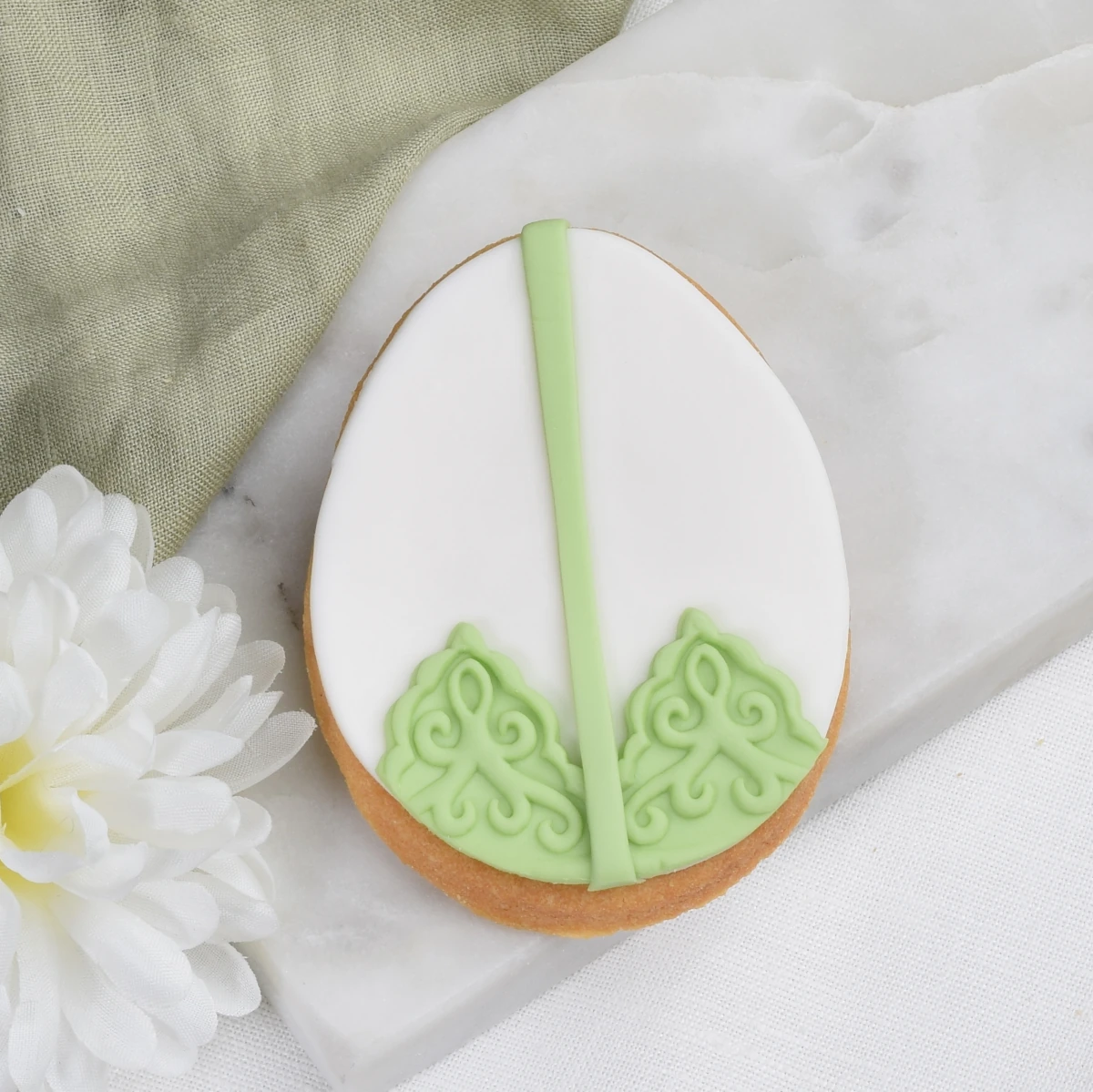 Ciasteczko w kształcie pisanki, pokryte białym lukrem z jasnozielonym zdobieniem.