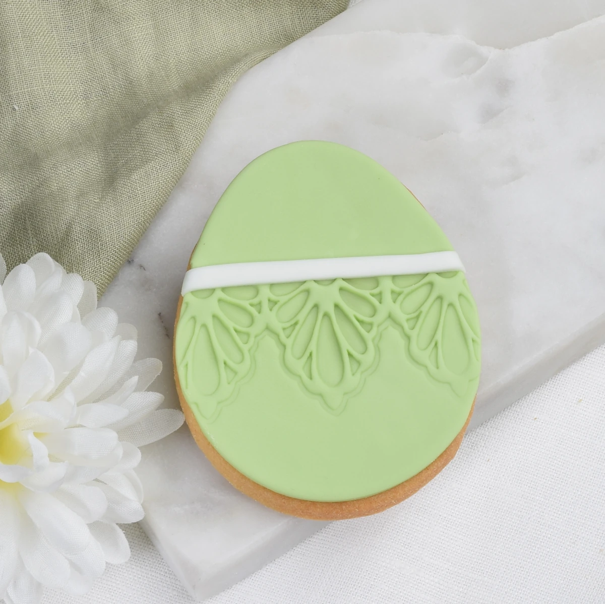 Ciasteczko w kształcie pisanki, pokryte jasnozielonym lukrem z ozdobnym paskiem.