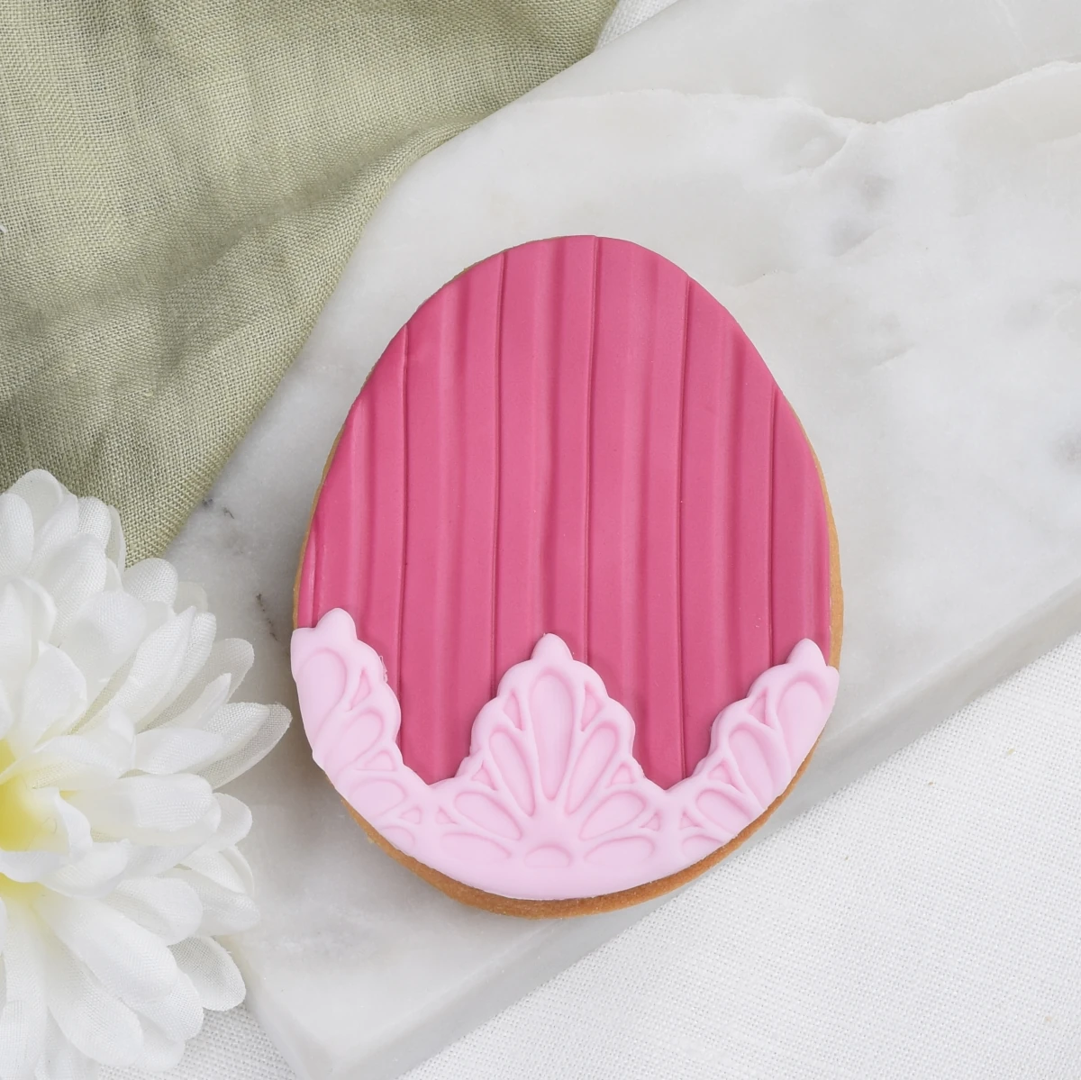 Ciasteczko w kształcie pisanki, pokryte burgundowym lukrem z tłoczonymi paseczkami i koronkowym zdobieniem.