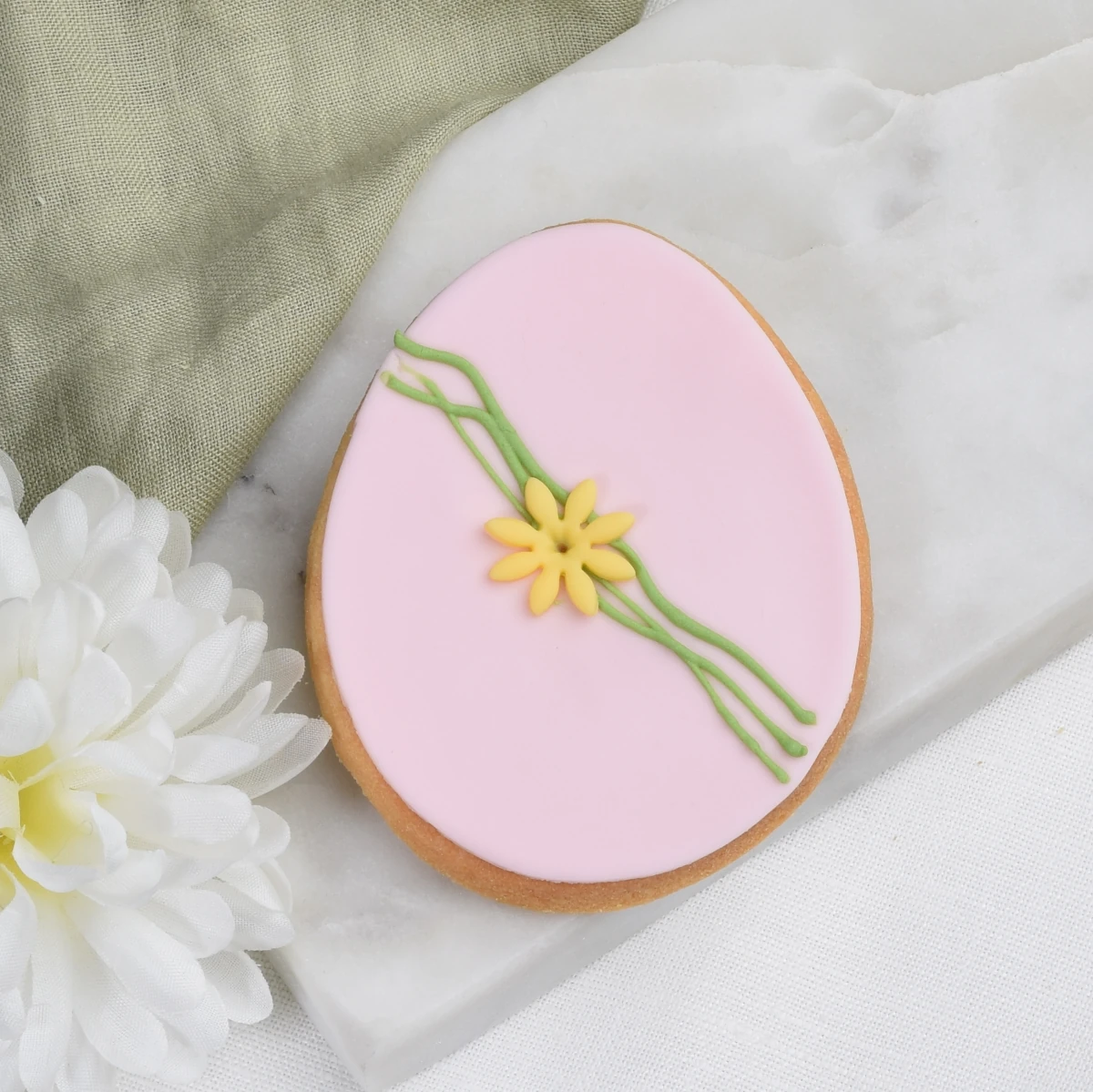 Ciasteczko w kształcie pisanki, pokryte bladoróżowym lukrem z ozdobną zieloną gałązką i kwiatkiem.