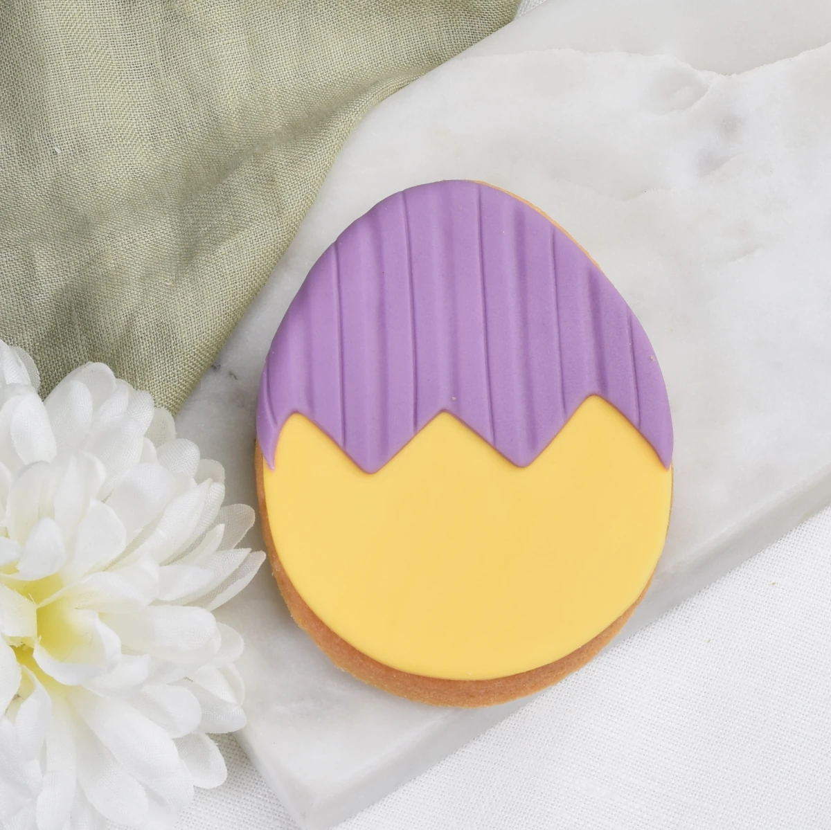 Ciasteczko w kształcie pisanki, z żółto - fioletowym lukrem.