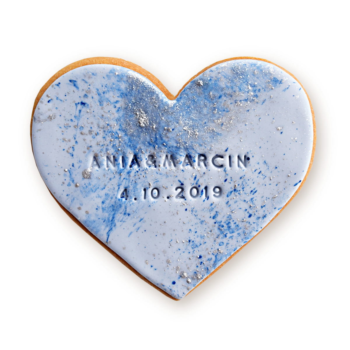 Ciastko lukrowane z gładkim, jednobarwnym lukrem, oprószone srebrnym pyłkiem i chlapnięte "akwarelą". Ciasteczka z kolekcji Stardust to nasz totalny hit :) Sprawdzi się idealnie jako piękny, minimalistyczny upominek dla gości weselnych. Na ciasteczku możesz umieścić własny tekst. Ciasteczko pakowane oddzielnie w woreczek przewiązany lnianym sznureczkiem z dodanym bilecikiem z eko kartonika.
