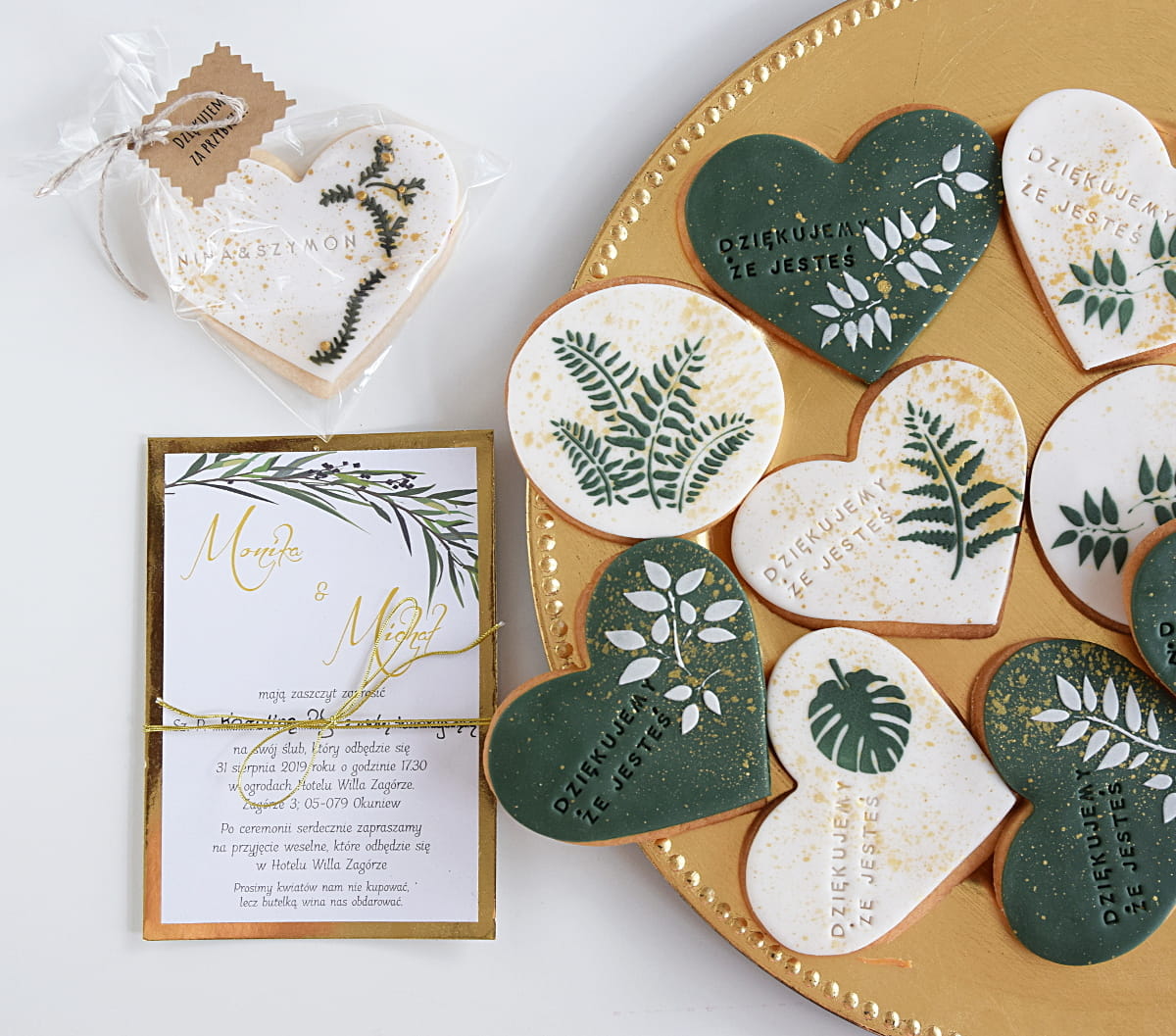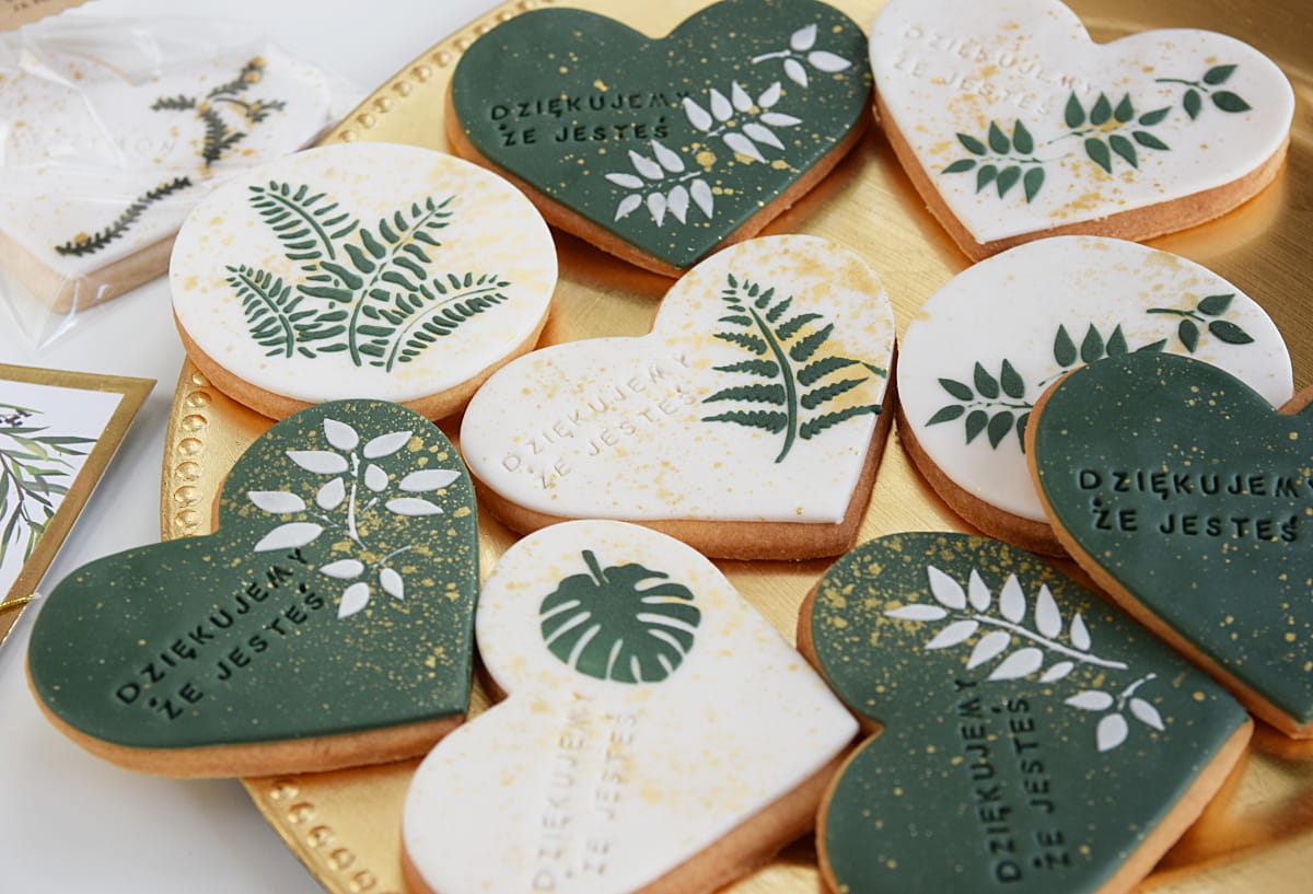 Ciasteczko lukrowane z serii Stardust Botanica. Ciasteczko z motywem roślinnym, oprószone złotym pyłkiem (kochamy połączenie złota i liści!). Na ciasteczku możesz umieścić własny tekst. Każde ciacho zapakowane jest oddzielnie w woreczek przewiązany lnianym sznureczkiem i dodaną etykietką z eko kartonu. Ciasteczko nada się idealnie na podziękowanie dla gości na uroczystościach w stylu boho jak i glamour. Super pasuje również do chrzcin i komunii.