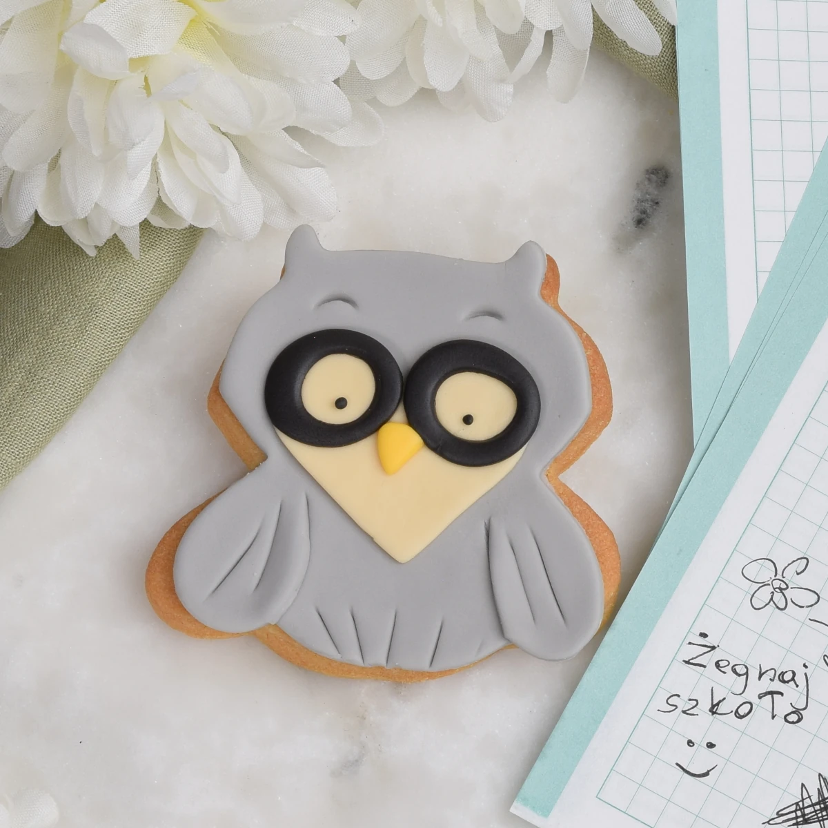 Pyszne, maślane ciasteczko w kształcie uroczej sowy w okularach. Jako że sowa to symbol mądrości i nauki to jest to idealne ciasteczko na prezent z okazji kończącego się roku szkolnego: możecie wręczyć je ulubionym nauczycielom albo zanieść do klasy na pożegnanie z koleżankami i kolegami. Nasza lukrowana sowa z pewnością wywoła też uśmiech na twarzy Cioć w przedszkolu. Każde ciasteczko pakujemy oddzielnie w woreczek przewiązany lnianym sznureczkiem i dodajemy kraftowy bilecik. Na bileciku umieścimy napis, który wskażesz spośród kilku naszych propozycji.