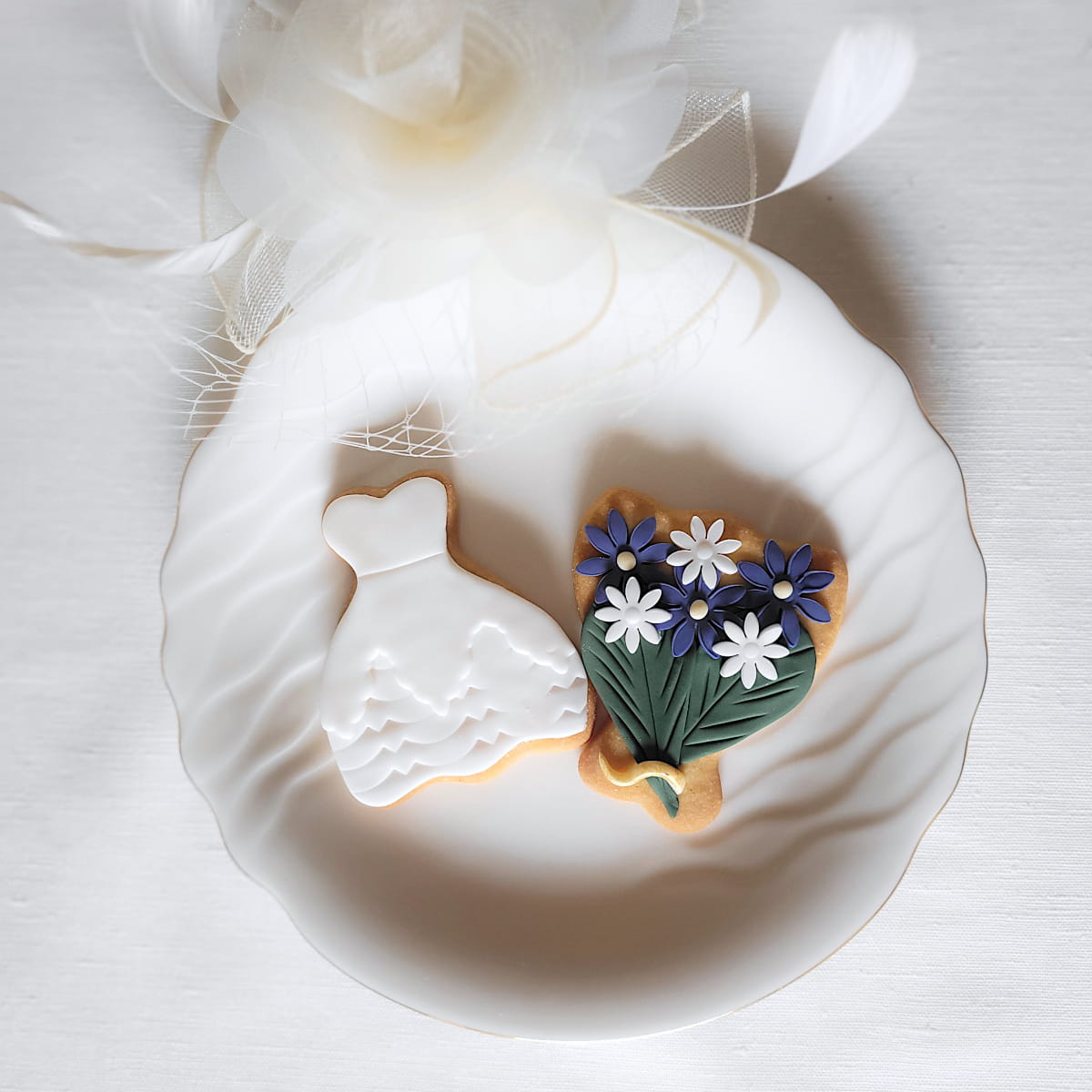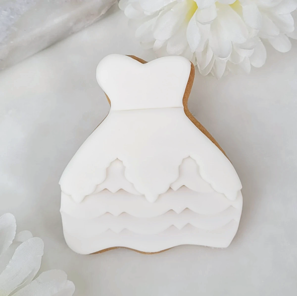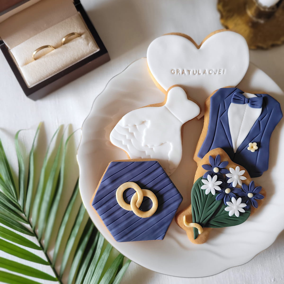 Poznaj nasze urocze ciasteczko maślane w kształcie sukni ślubnej, które zachwyca swoim delikatnym wyglądem i wyrafinowanym stylem. Pokryte śnieżnobiałym lukrem, ciasteczko doskonale odzwierciedla elegancję klasycznej sukni panny młodej. Subtelne falbany wykonane z lukru tworzą efekt warstwowej spódnicy, nadając mu lekkości i romantyzmu. Jest to doskonały wybór na przyjęcia weselne, wieczory panieńskie, a także jako wyjątkowy dodatek do prezentów dla gości weselnych.