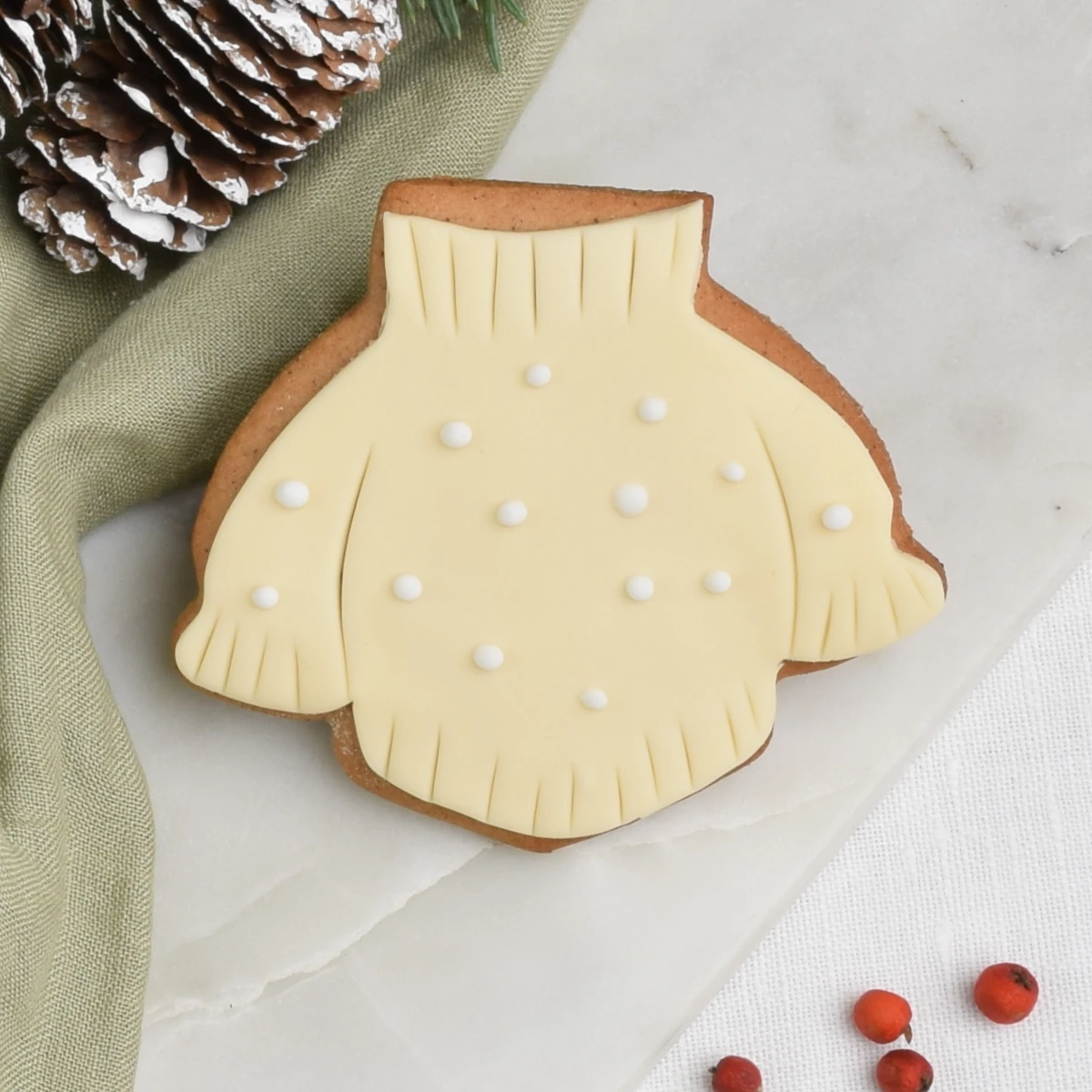 Ciastko lukrowane w kształcie swetra z golfem i pomponami, to kolejna propozycja z naszej ciastkowej garderoby. Lukrowany, zimowy sweter to urocza i pyszna dekoracja na zimowych eventach. Jakoś tak mamy, że z wyjątkowym sentymentem traktujemy ciastka, które udają ubrania albo jedzenie ;) Nasz sweter świetnie komponuje się z innymi ciastkowymi częściami garderoby :) Co jeszcze oferuje Ci nasze ciastko? Możesz wybrać rodzaj ciasta bazowego - przygotujemy je dla Ciebie na pachnącym świętami, aromatycznym cieście piernikowym albo na naszym klasycznym, pysznym cieście maślanym. Pierniczek ma dziurkę - wystarczy, że przebijesz igiełką lukier i możesz swoje ciacho powiesić na choince. Każde ciastko pakujemy oddzielnie w woreczek foliowy, przewiązujemy lnianym sznureczkiem i dodajemy bilecik. Możesz wybrać tekst spośród kilku naszych propozycji i w ten sposób sprawić, że Twoje ciastko jest jeszcze bardziej Twoje.