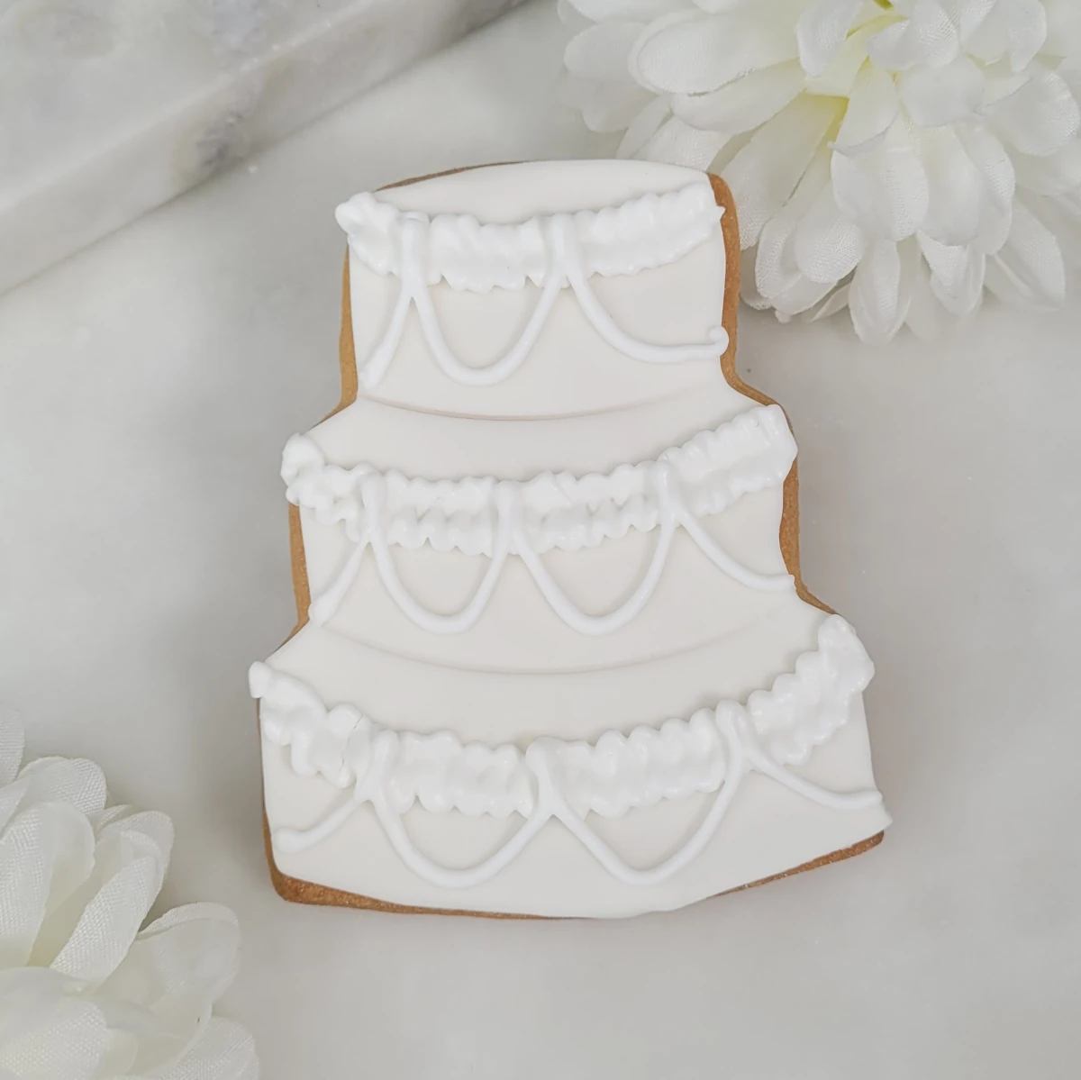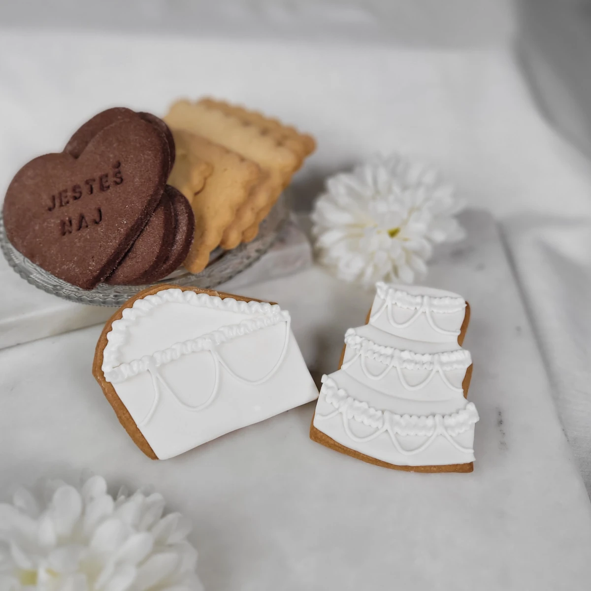 Ciasteczko maślane KUKI w kształcie piętrowego tortu weselnego to prawdziwe dzieło sztuki cukierniczej! To urocze ciasteczko, pokryte białym lukrem i bogato zdobione, przypomina najpiękniejsze eleganckie torty angielskie. Każdy detal jest starannie wykonany, co sprawia, że doskonale wpisuje się w estetykę wesel w stylu glamour. Wyjątkowy wygląd i smak naszych ciasteczek z pewnością oczaruje wszystkich gości.