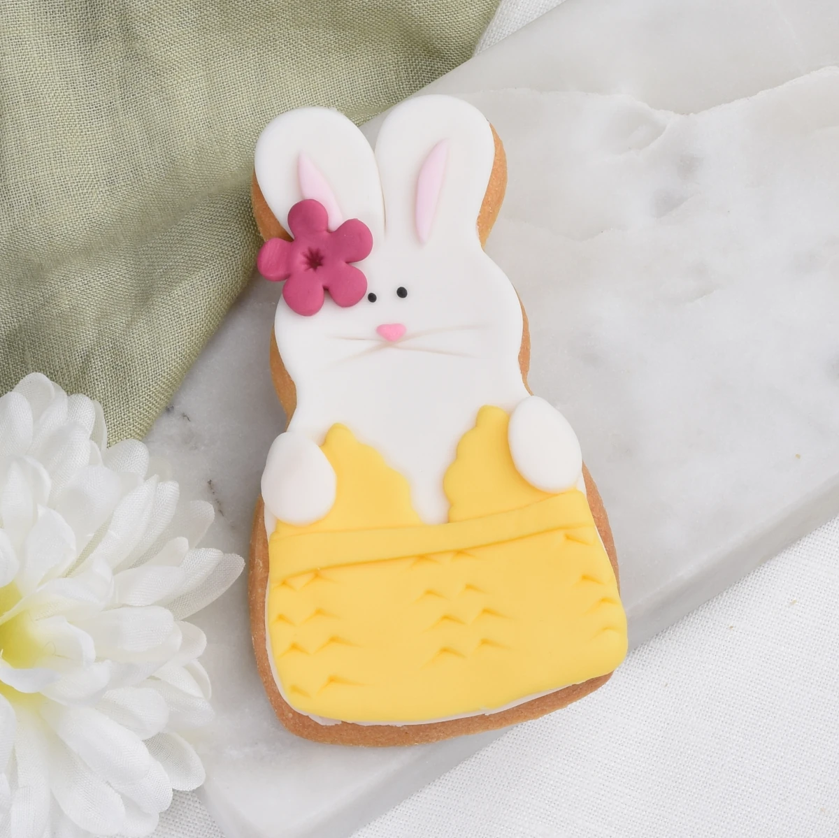 Ciasteczko lukrowane w formie wielkanocnego zajączka trzymającego w łapkach marchewkę.