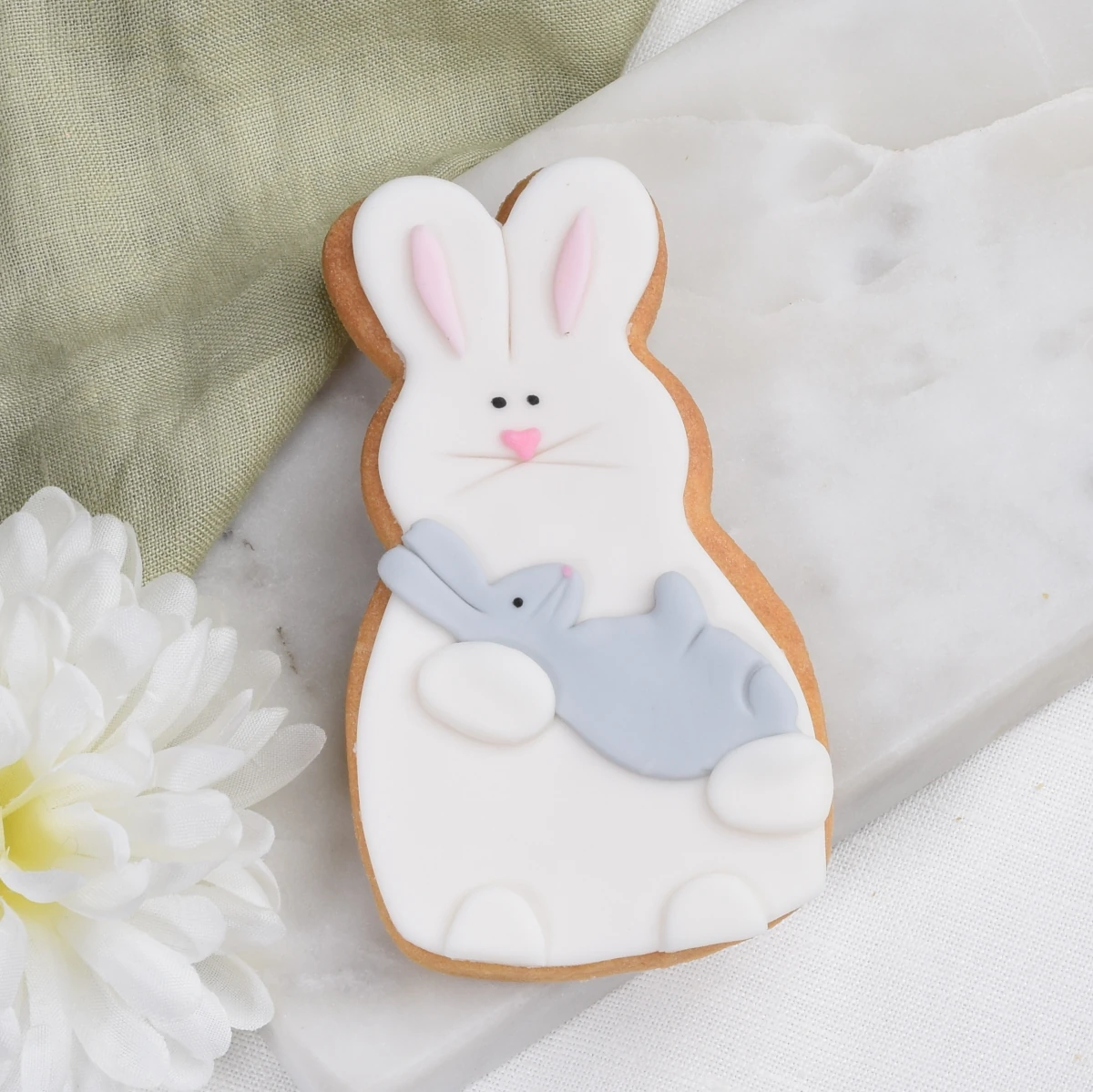 Ciasteczko lukrowane w formie wielkanocnego zajączka trzymającego w łapkach marchewkę.