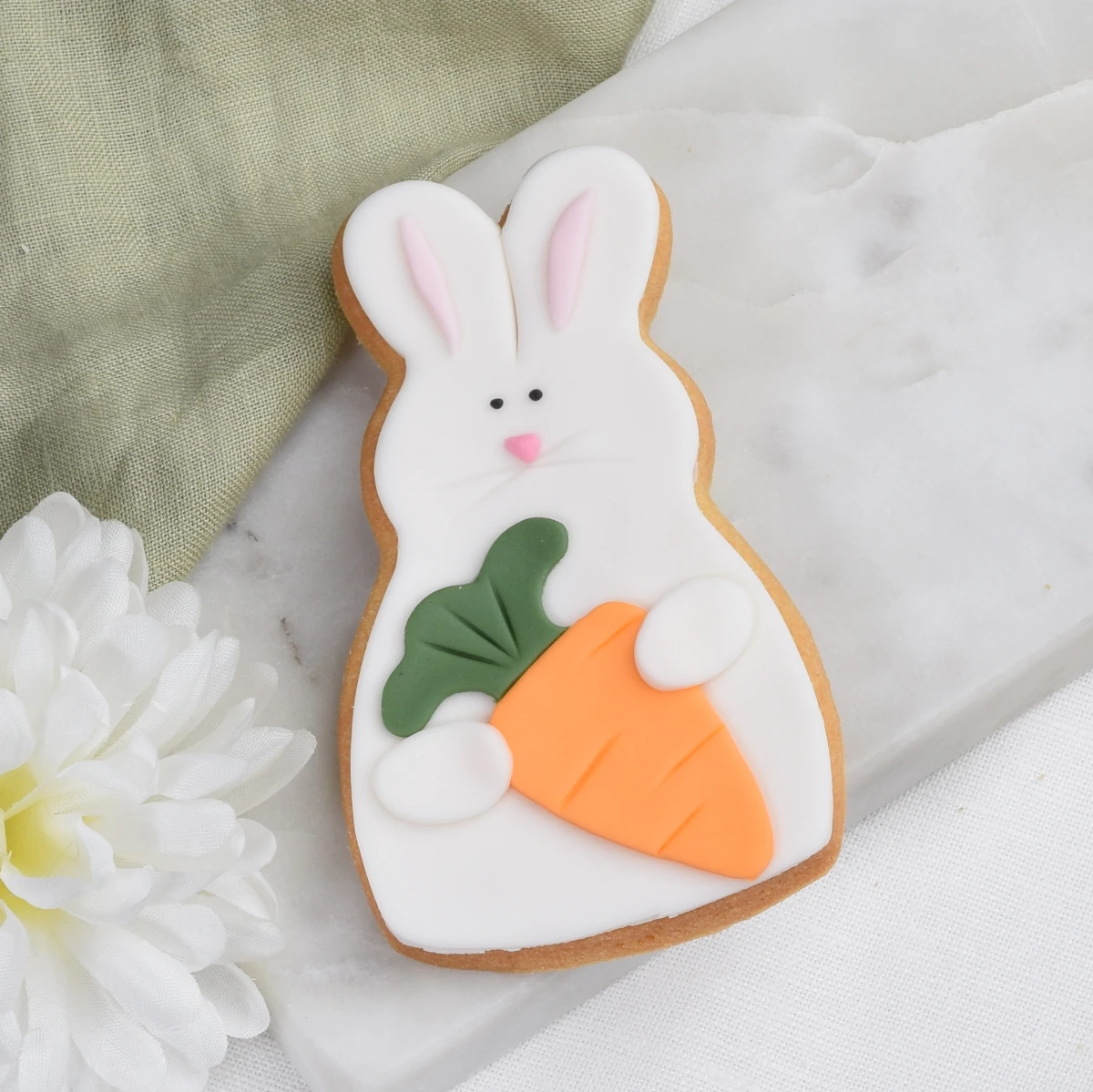 Ciasteczko lukrowane w formie wielkanocnego zajączka trzymającego w łapkach marchewkę.