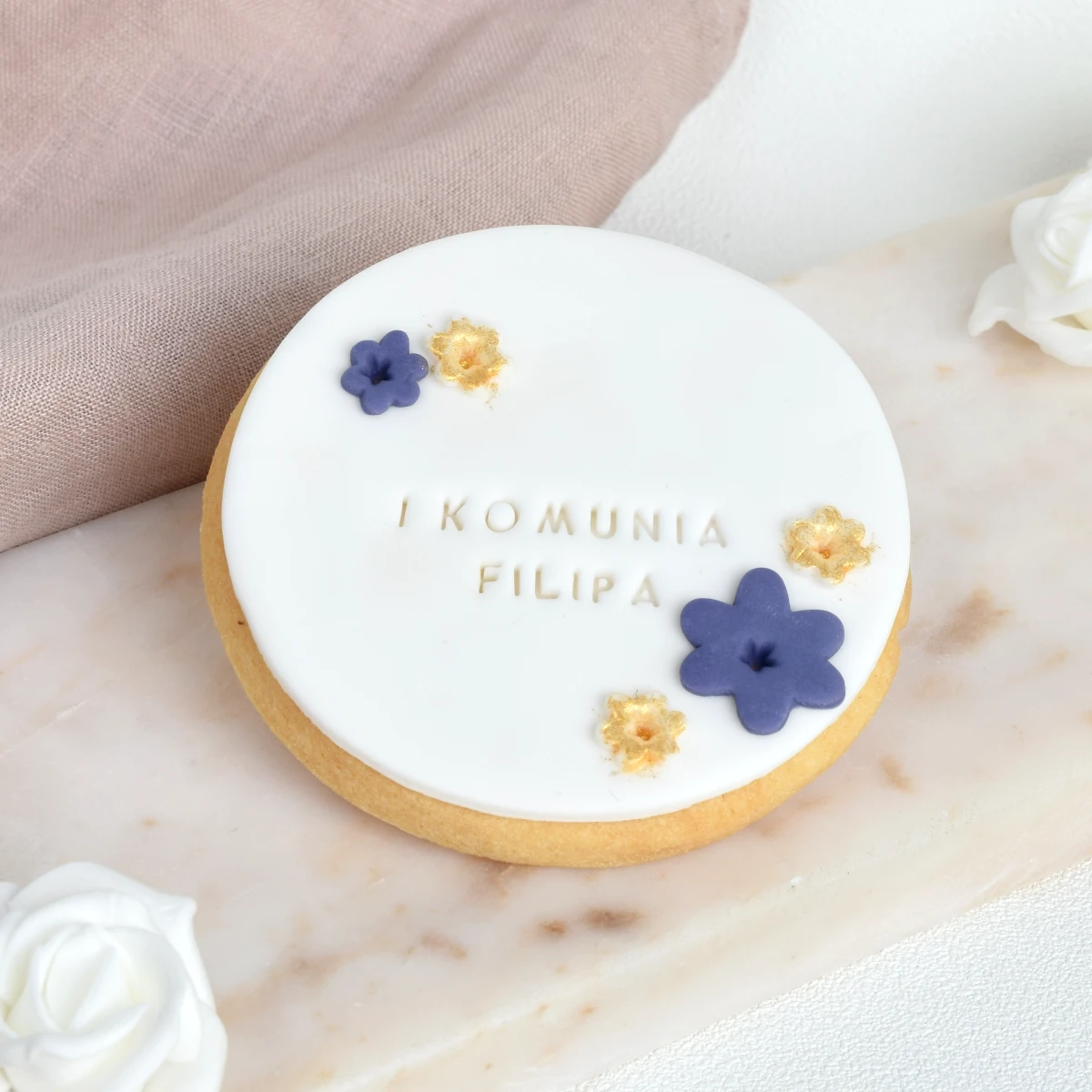 Szukasz prezentu dla gości na ważnej dla Ciebie uroczystości? Wyjawimy Ci tajemnicę - pyszne, maślane i na dodatek ręcznie robione ciasteczka to zawsze dobry pomysł na prezent! Jeśli dodamy do tego efektowne zdobienie i możliwość personalizacji to mamy idealny upominek. Na ciasteczku możesz umieścić własny tekst - imiona, datę ważnego dnia lub podziękowanie - co tylko chcesz. Dzięki personalizowanym napisom Twoje ciasteczka będą nie tylko miłym, ale też bardzo osobistym gestem. Kolekcję z granatowo złotymi kwiatkami szczególnie polecamy na Komunię i Chrzest, jednak jest ona na tyle uniwersalna, że według nas równie dobrze odnajdzie się na uroczystych weselach jako podziękowanie dla gości lub podziękowanie za współpracę na imprezie firmowej. Ciasteczka pakujemy każde oddzielnie w woreczek przewiązany lnianym sznureczkiem i dodajemy eko bilecik z kilkoma tekstami do wyboru.