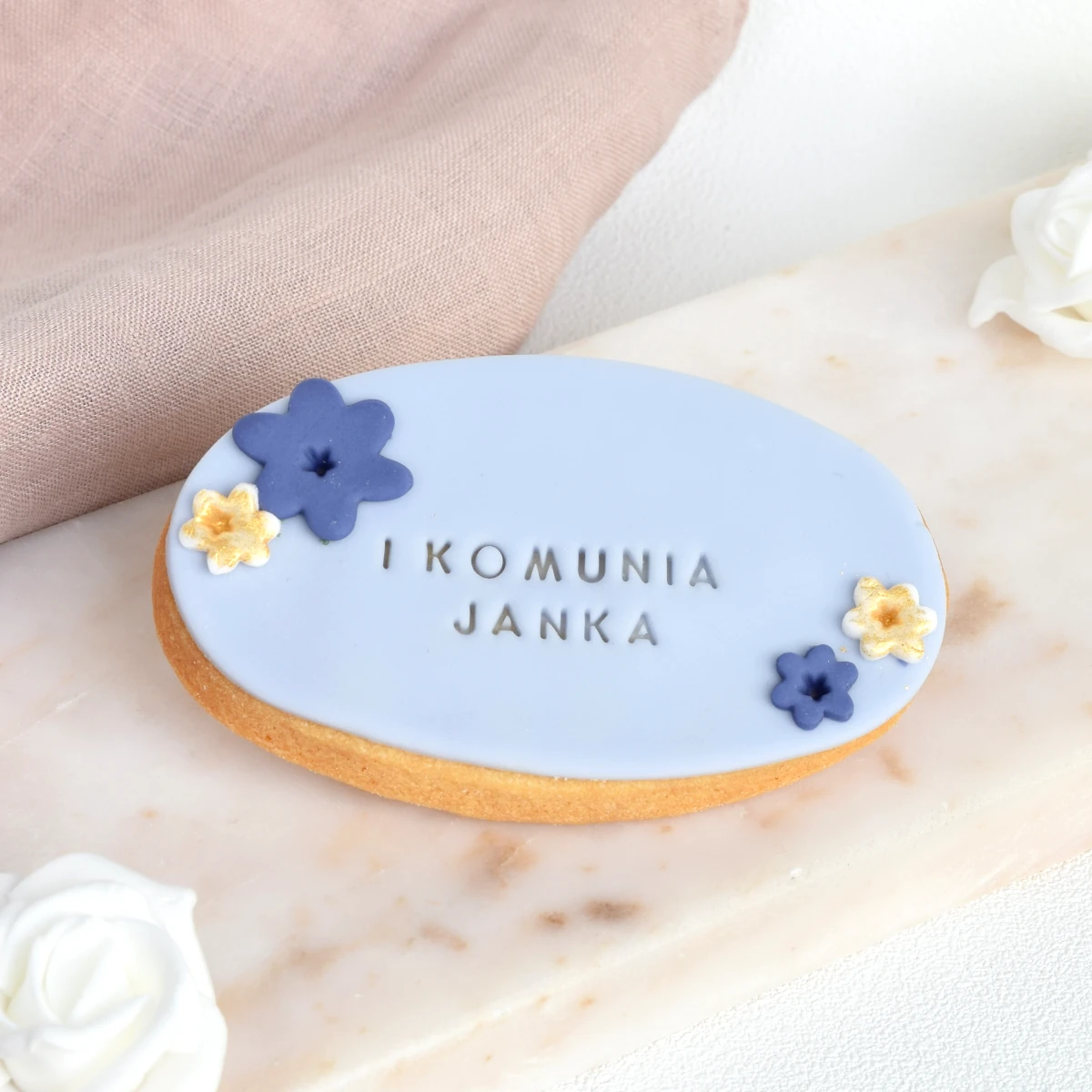 Szukasz prezentu dla gości na ważnej dla Ciebie uroczystości? Wyjawimy Ci tajemnicę - pyszne, maślane i na dodatek ręcznie robione ciasteczka to zawsze dobry pomysł na prezent! Jeśli dodamy do tego efektowne zdobienie i możliwość personalizacji to mamy idealny upominek. Na ciasteczku możesz umieścić własny tekst - imiona, datę ważnego dnia lub podziękowanie - co tylko chcesz. Dzięki personalizowanym napisom Twoje ciasteczka będą nie tylko miłym, ale też bardzo osobistym gestem. Kolekcję z granatowo złotymi kwiatkami szczególnie polecamy na Komunię i Chrzest, jednak jest ona na tyle uniwersalna, że według nas równie dobrze odnajdzie się na uroczystych weselach jako podziękowanie dla gości lub podziękowanie za współpracę na imprezie firmowej. Ciasteczka pakujemy każde oddzielnie w woreczek przewiązany lnianym sznureczkiem i dodajemy eko bilecik z kilkoma tekstami do wyboru.