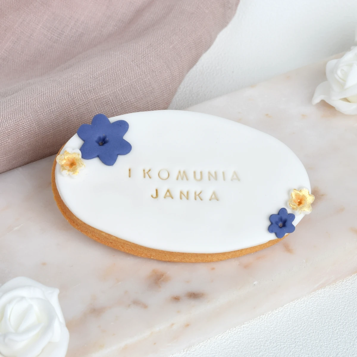 Szukasz prezentu dla gości na ważnej dla Ciebie uroczystości? Wyjawimy Ci tajemnicę - pyszne, maślane i na dodatek ręcznie robione ciasteczka to zawsze dobry pomysł na prezent! Jeśli dodamy do tego efektowne zdobienie i możliwość personalizacji to mamy idealny upominek. Na ciasteczku możesz umieścić własny tekst - imiona, datę ważnego dnia lub podziękowanie - co tylko chcesz. Dzięki personalizowanym napisom Twoje ciasteczka będą nie tylko miłym, ale też bardzo osobistym gestem. Kolekcję z granatowo złotymi kwiatkami szczególnie polecamy na Komunię i Chrzest, jednak jest ona na tyle uniwersalna, że według nas równie dobrze odnajdzie się na uroczystych weselach jako podziękowanie dla gości lub podziękowanie za współpracę na imprezie firmowej. Ciasteczka pakujemy każde oddzielnie w woreczek przewiązany lnianym sznureczkiem i dodajemy eko bilecik z kilkoma tekstami do wyboru.