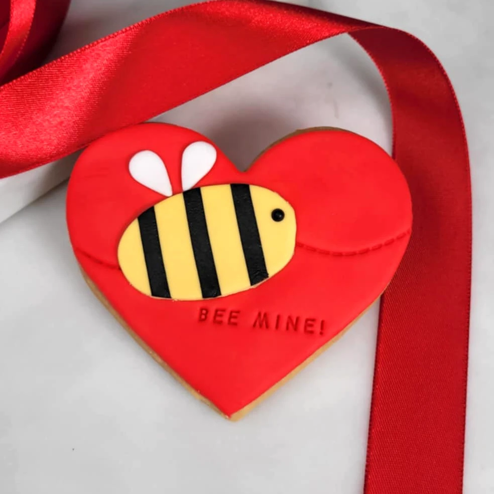 Maślane ciasteczko walentynkowe, które wywołuje uśmiech. Serduszko pokryte czerwonym lukrem z uroczą pszczółką i śmiesznym napisem "Bee mine".