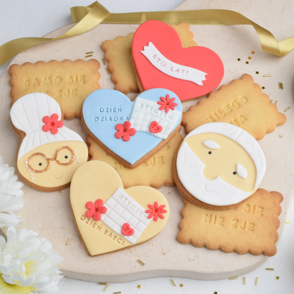 Klasyczny zestaw ciasteczek z okazji Dnia Babci i Dziadka, w którym każdy znajdzie coś dla siebie. Zestaw składa się z 10 ciasteczek z czego 5 ciach to urocze, zdobione lukrem wzory nawiązujące do tematu święta. Mamy tu ciasteczkowe wizerunki seniorów, na widok których uśmiechnie się nawet najbardziej nowoczesna babcia ;). Kalendarze z zaznaczonymi datami, co by przypadkiem nie przeoczyć tak ważnego dnia oraz serduszko które pomieści krótkie, ale pełne miłości życzenia. Pozostałe 5 ciach to gratka dla fanów klasyki czyli nasze niezawodne, maślane ciastka bez lukru. Ciasteczka bez lukru możesz personalizować! Odciśniemy na nich Twój tekst by prezent stał się jeszcze bardziej osobisty. Ciasteczka pakujemy w eleganckie, ekologiczne pudełko o wymiarach 20/20/4 cm. Dzięki okienku, wszystkie ciasteczka są pięknie wyeksponowane a prezent jest gotowy do wręczania :)
