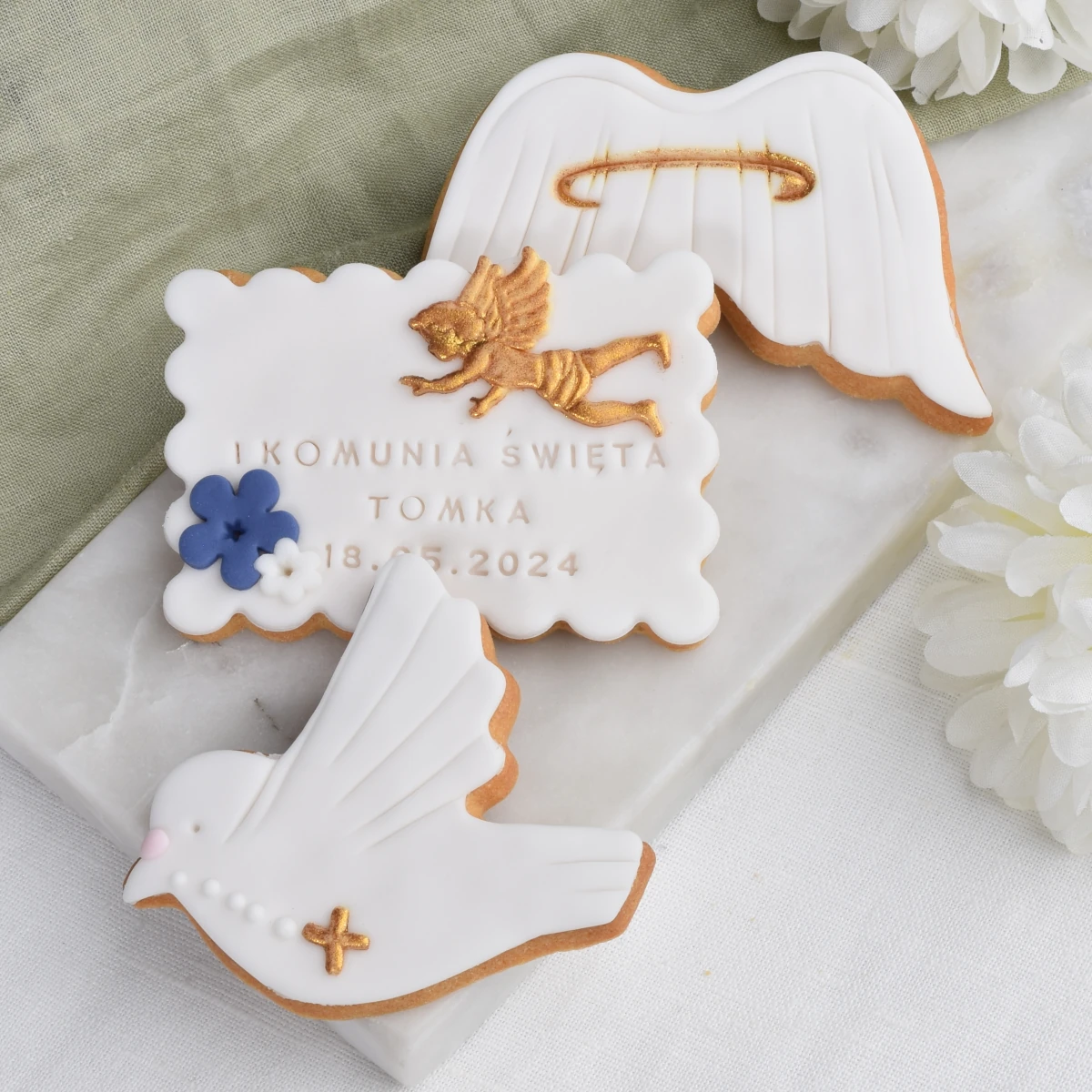 Zestaw trzech, pysznych, maślanych ciasteczek ozdobionych lukrem z motywem gołąbka, aniołka i kwiatów to idealny pomysł na prezent dla rodziców chrzestnych na pierwszą komunię albo chrzest. Sprawdź również nasze pojedynczo pakowane ciasteczka z motywem aniołka w tym samym stylu co w zestawie! Będą idealnie spójnym podziękowaniem dla pozostałych gości uroczystości :) Zajrzyj do Produktów powiązanych! Na jednym ciasteczku możesz umieścić swój tekst, np podziękowanie dla rodziców chrzestnych lub imię dziecka i datę sakramentu. Ciasteczka pakujemy w kraftowe pudełko z okienkiem o wymiarach 13/20/4 cm, są już gotowym do wręczania prezentem.