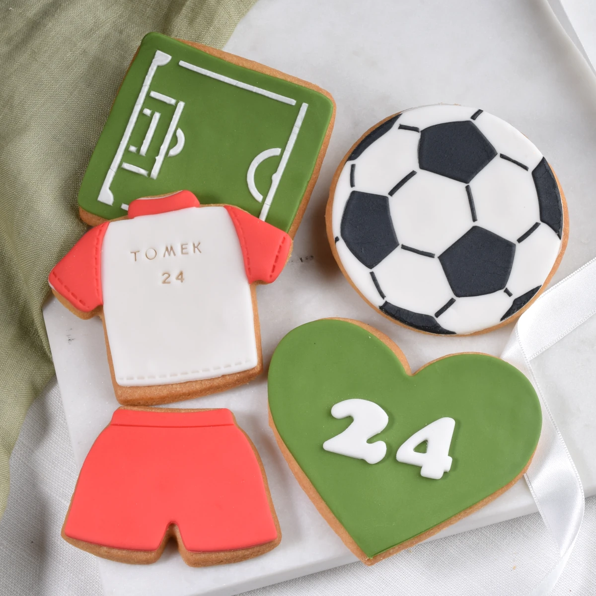 Zestaw pięciu, pysznych, maślanych ciasteczek z motywami piłkarskimi. Te ciasteczka dla fanów piłki nożnej to idealny prezent na urodziny. Ciasteczka możesz personalizować umieszczając liczbę na sercu i imię oraz numer na koszulce. Jeśli Twoje piłkarskie ciasteczka to nie prezent urodzinowy to możesz też wpisać inny, dowolny napis, który umieścimy na serduszku - wpisz napis w polu Uwagi. UWAGA: maksymalna długość napisu to 33 znaki!